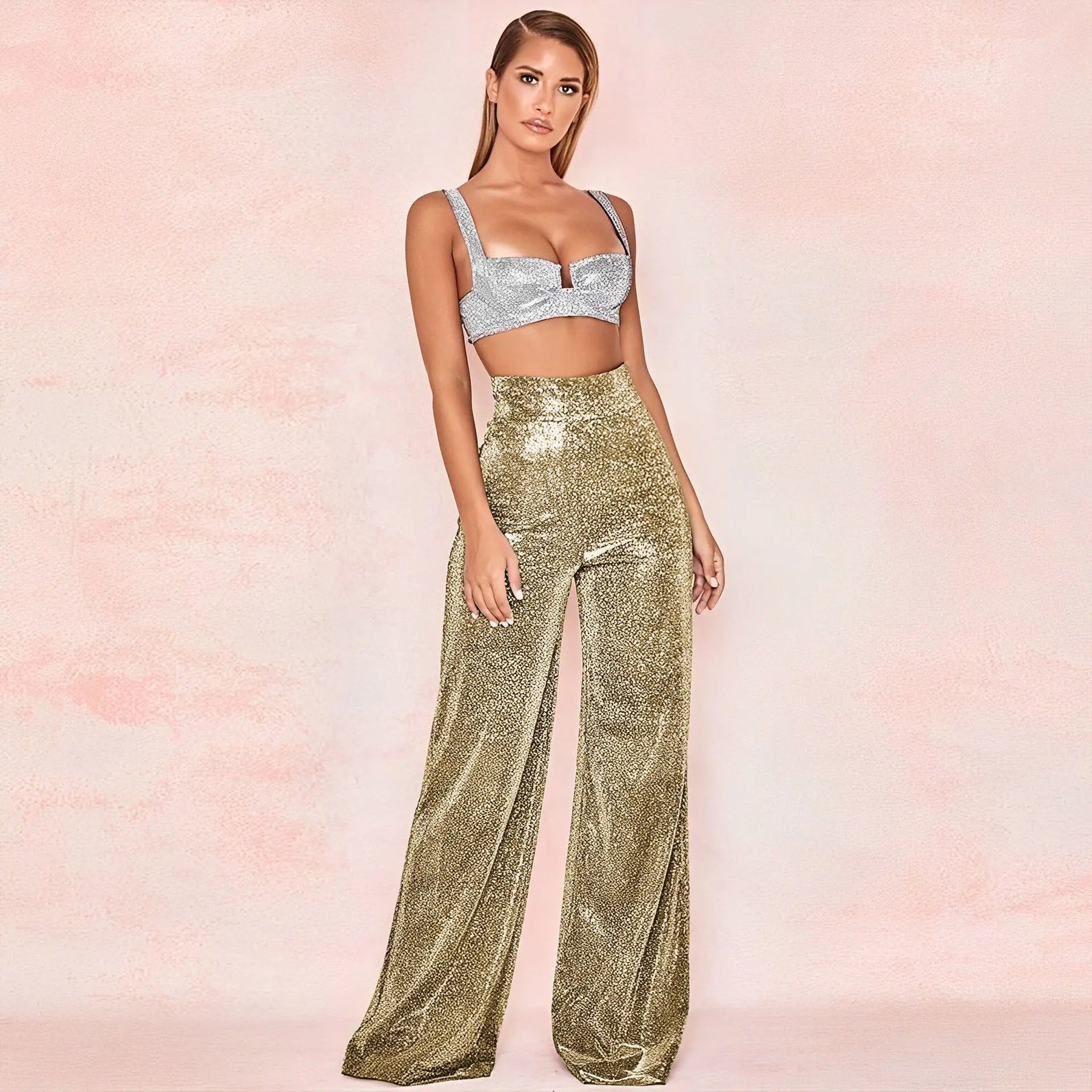 Women's High-Waisted Wide-Leg Trousers - Metallic Shimmer - Elegant Partywear. Make a statement with these shimmering metallic trousers. Featuring a flattering high waist and elegant wide-leg cut, they offer a bold and glamorous look perfect for parties and nights out. These trousers are designed to make you stand out from the crowd.